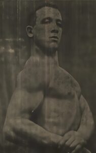 B) Sztabę żelazną grubości 12 mm, szer. 34 mm, długości 2.80 m zginaną przez dwóch żołnierzy trzymał w zębach, trzymając jednocześnie na obu ramionach takie same dwie sztaby zginane przez 4 żołnierzy.