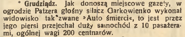 Aleksander Garkowienko był jednym z tych atletów, którzy nie poprzestawali na zapaśnictwie. Słynący z wszechstronnej sprawności i siły nie unikał nietypowych pokazów, na których demonstrował swoje umiejętności. W jednej z gazet natrafiłem na wzmiankę o takim właśnie wydarzeniu. Dla mieszkańców Grudziądza taki pokaz był z pewnością nie lada gratką!