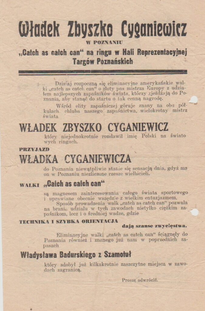 Rok 1937- Poznań gości najlepszych zapaśników Europy, którzy stają do walki o Złoty Pas. Organizatorem turnieju są bracia Cyganiewicze. Faworytem turnieju jest młodszy z braci- Władek. Stanisław zajmuje się już głównie kwestiami organizacyjnymi. W zbiorach Wacława Badurskiego natknąłem się na broszurkę z Dziennika Porannego reklamującą turniej. Dzięki codziennym, szczegółowym i barwnym relacjom w tejże gazecie, możemy odtworzyć przebieg wielkiej imprezy, która odbywała się na ringu w hali Międzynarodowych Targów Poznańskich. Działo się!