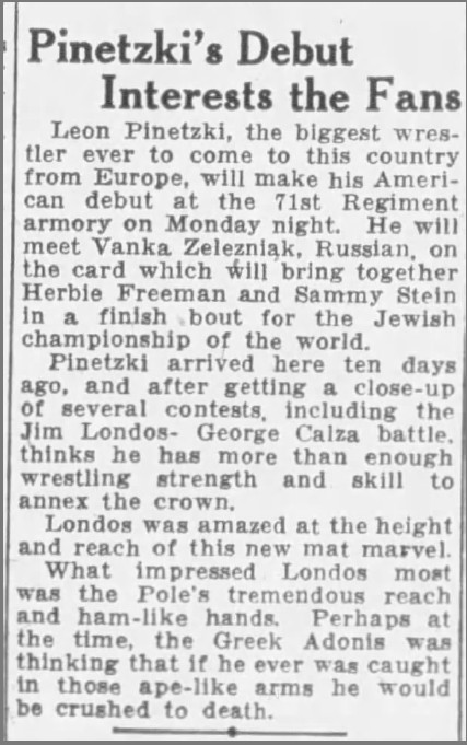 Leon Pinetzki, największy zapaśnik, jaki kiedykolwiek przybył do tego kraju z Europy, zadebiutuje w Ameryce w poniedziałkowy wieczór w hali 71st Regiment Armory. Zmierzy się z Rosjaninem Vanką Zelezniakiem podczas gali, na której Herbie Freeman i Sammy Stein stoczą decydującą walkę o żydowskie mistrzostwo świata.